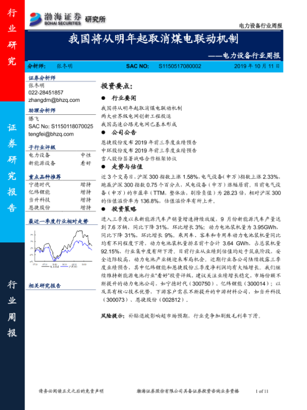 【渤海证券】【20191011】电力设备行业周报:我国将从明年起取消煤电联动机制-11页
