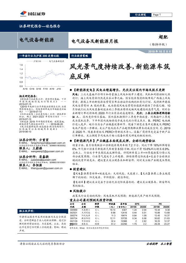 【国信证券】【20191008】电气设备及新能源月报:风光景气度持续改善,新能源车筑底反弹-22页