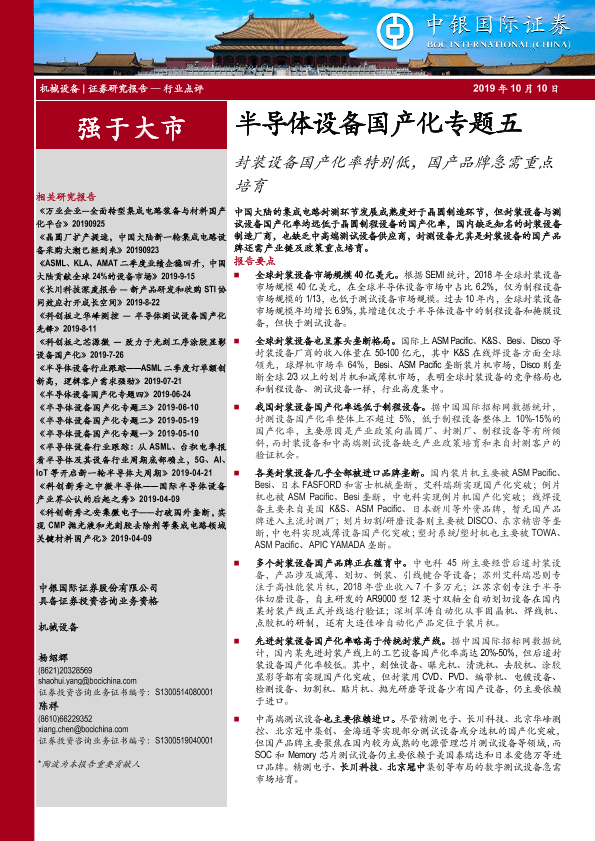 【中银证券】【20191010】半导体设备国产化专题五:封装设备国产化率特别低,国产品牌急需重点培育-8页