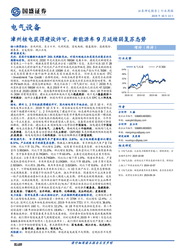 【国盛证券】【20191013】电气设备行业周报:漳州核电获得建设许可,新能源车9月延续弱复苏态势-18页