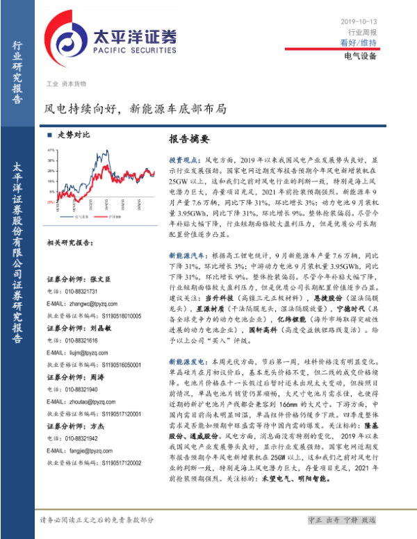 【太平洋证券】【20191013】20191013-太平洋-电气设备行业周报:风电持续向好,新能源车底部布局-18页