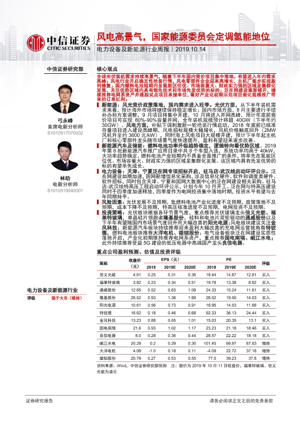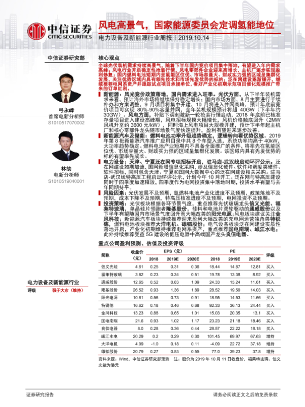 【中信证券】【20191014】电力设备及新能源行业周报:风电高景气,国家能源委员会定调氢能地位-10页