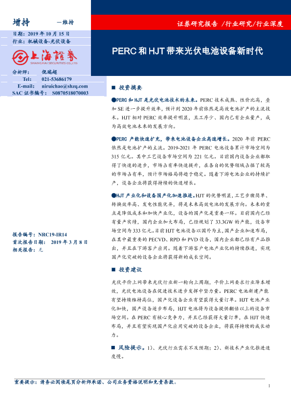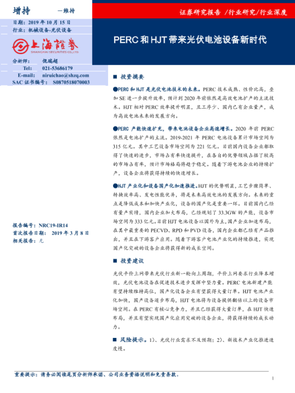 【上海证券】【20191015】光伏设备行业深度:PERC和HJT带来光伏电池设备新时代-21页