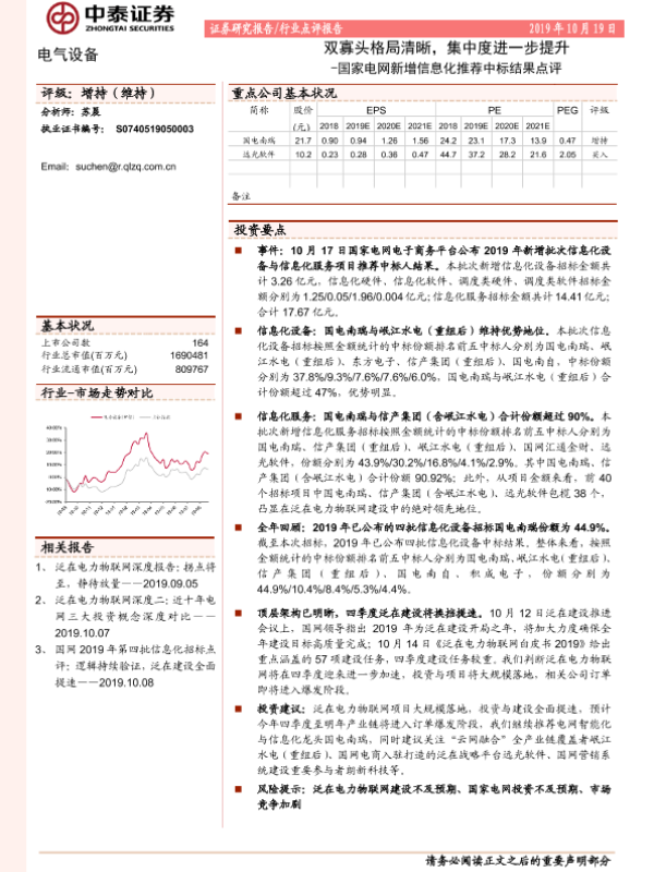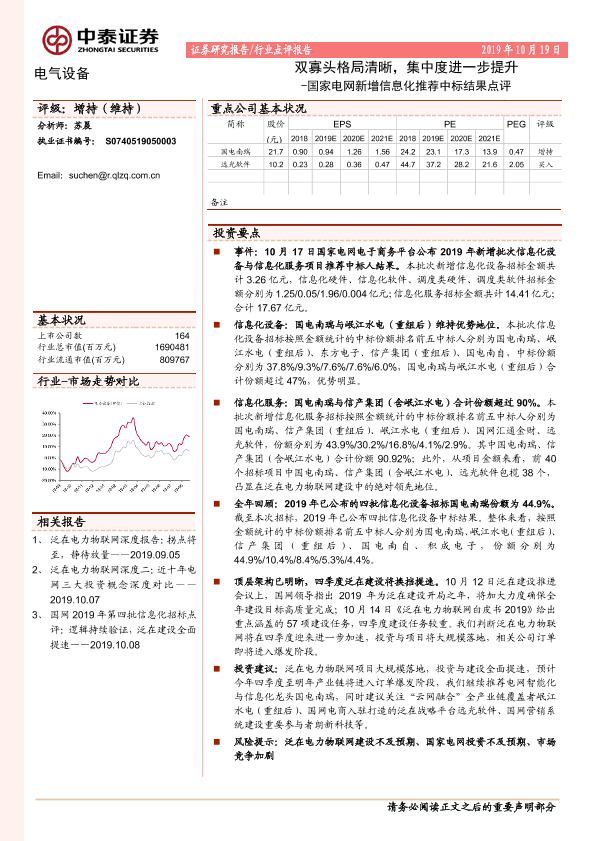 【中泰证券】【20191019】电气设备行业点评报告:国家电网新增信息化推荐中标结果点评-双寡头格局清晰,集中度进一步提升-11页