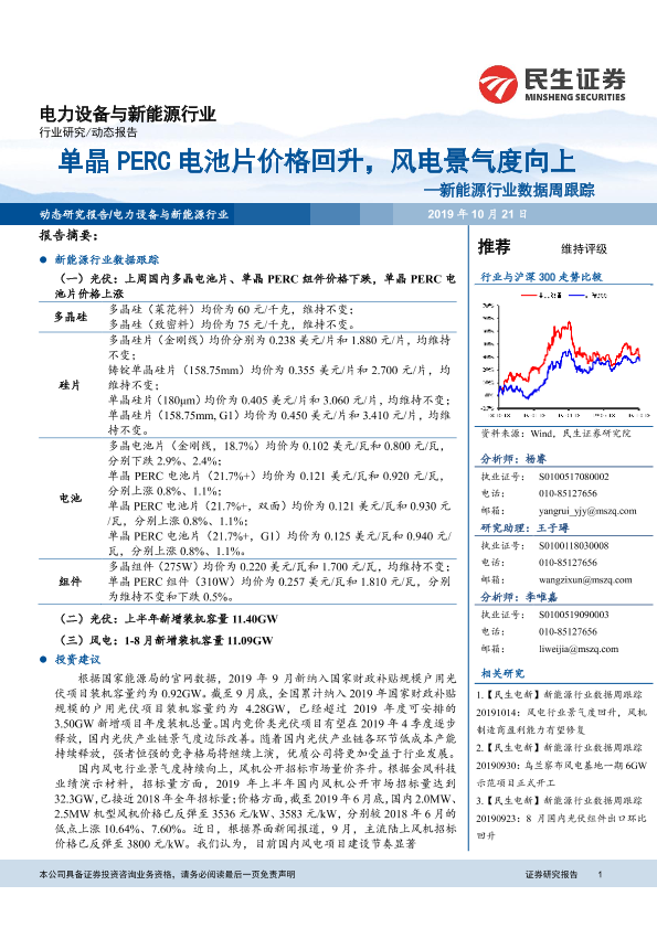 【民生证券】【20191021】20191021-民生证券-新能源行业数据周跟踪:单晶PERC电池片价格回升,风电景气度向上-10页