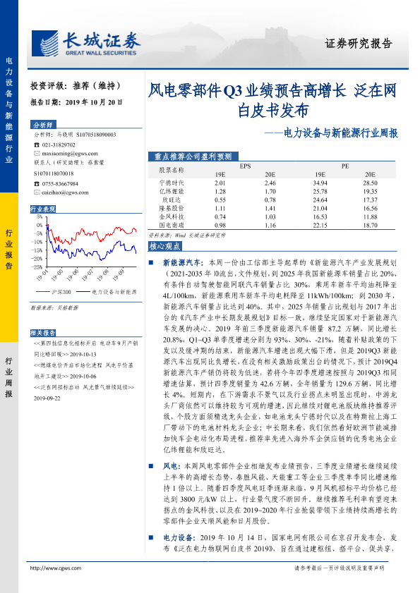 【长城证券】【20191020】电力设备与新能源行业周报:风电零部件Q3业绩预告高增长 泛在网白皮书发布-17页