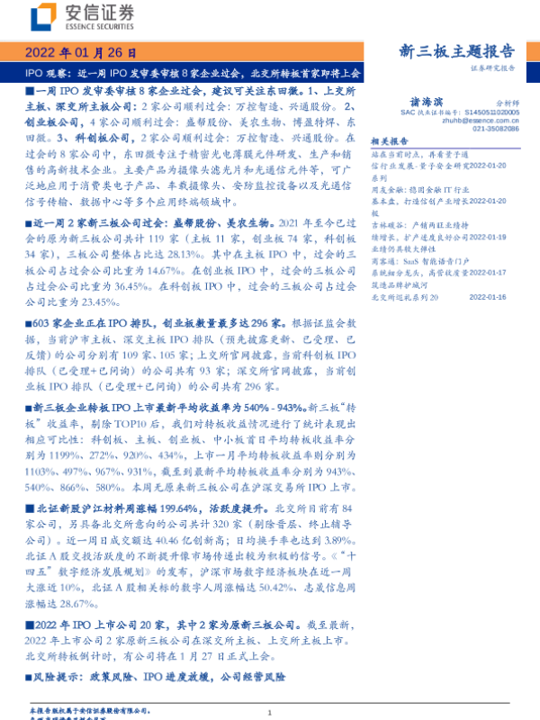【安信证券】【20220126】IPO观察:近一周IPO发审委审核8家企业过会,北交所转板首家即将上会-18页