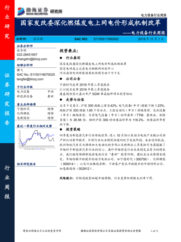 【渤海证券】【20191101】电力设备行业周报:国家发改委深化燃煤发电上网电价形成机制改革-11页