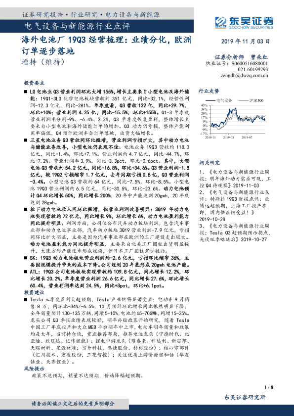 【东吴证券】【20191103】电气设备与新能源行业点评:海外电池厂19Q3经营梳理:业绩分化,欧洲订单逐步落地-8页