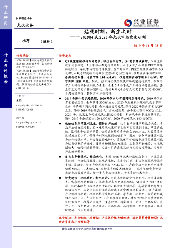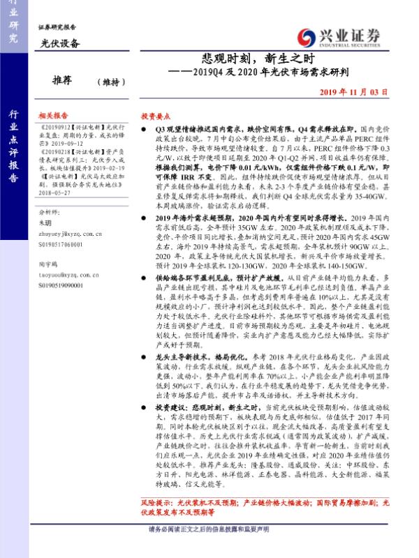 【兴业证券】【20191103】悲观时刻,新生之时——2019Q4及2020年光伏市场需求研判-9页