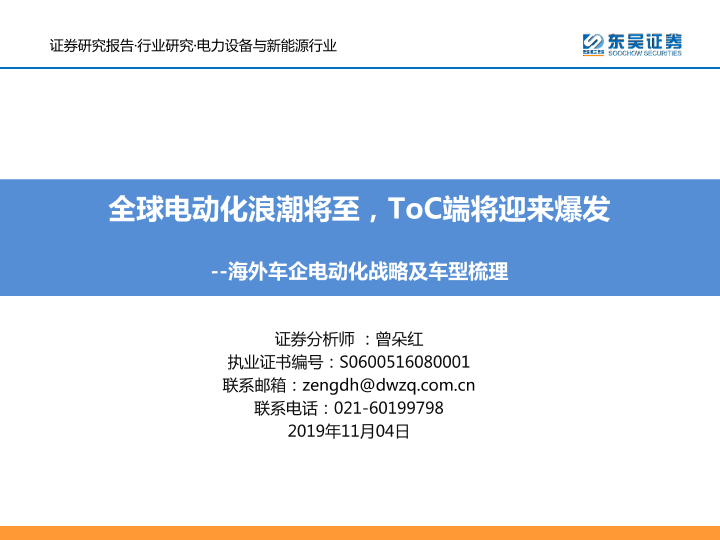 【东吴证券】【20191104】海外车企电动化戓略及车型梳理:全球电动化浪潮将至,ToC端将迎来爆发-65页