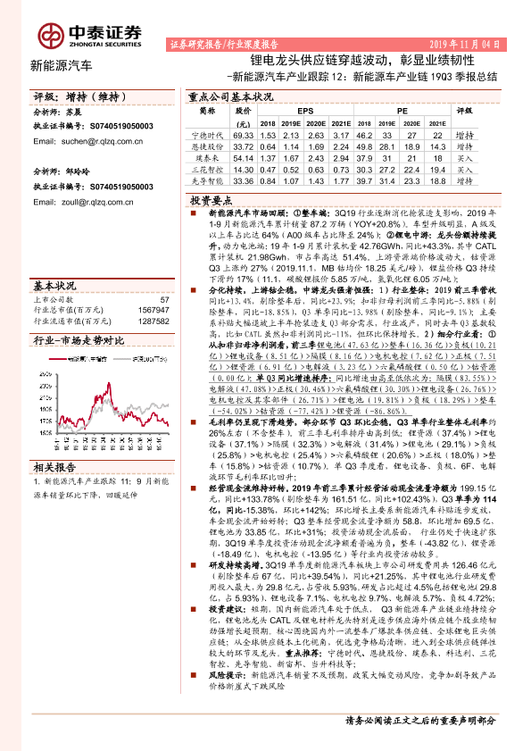 【中泰证券】【20191104】新能源汽车产业跟踪12:新能源车产业链19Q3季报总结-锂电龙头供应链穿越波动,彰显业绩韧性-28页