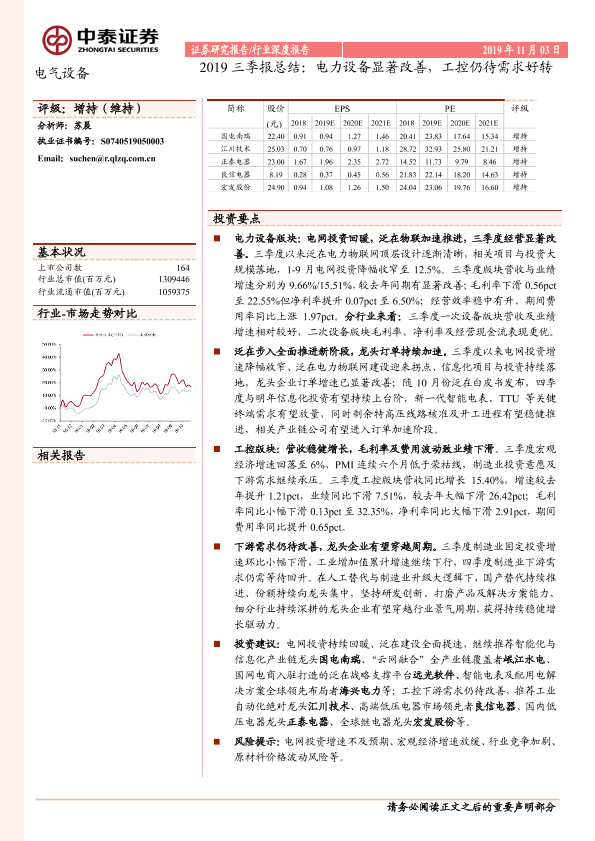 【中泰证券】【20191103】电气设备2019三季报总结:电力设备显著改善,工控仍待需求好转-39页