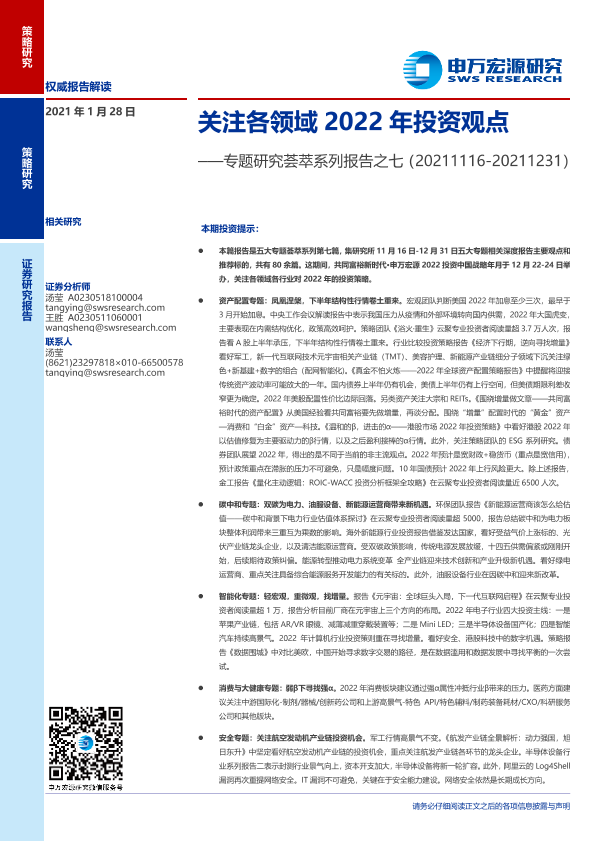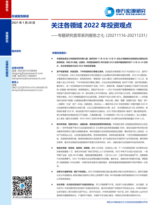 【申万宏源】【20220128】专题研究荟萃系列报告之七:关注各领域2022年投资观点-34页