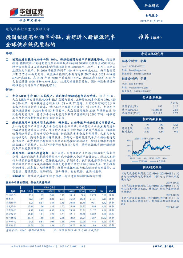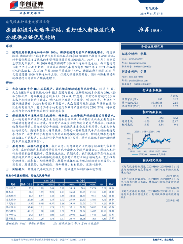【华创证券】【20191107】电气设备行业重大事项点评:德国拟提高电动车补贴,看好进入新能源汽车全球供应链优质标的-4页