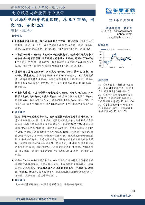 【东吴证券】【20191109】电力设备与新能源行业点评:9月海外电动车销量回暖,总8.7万辆,同比+1%,环比+26%-8页