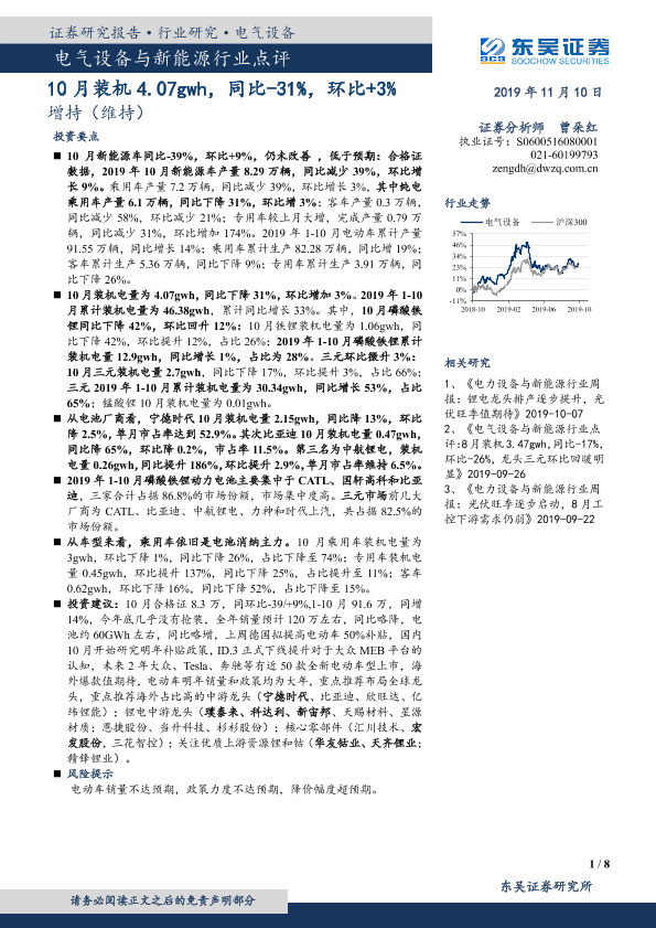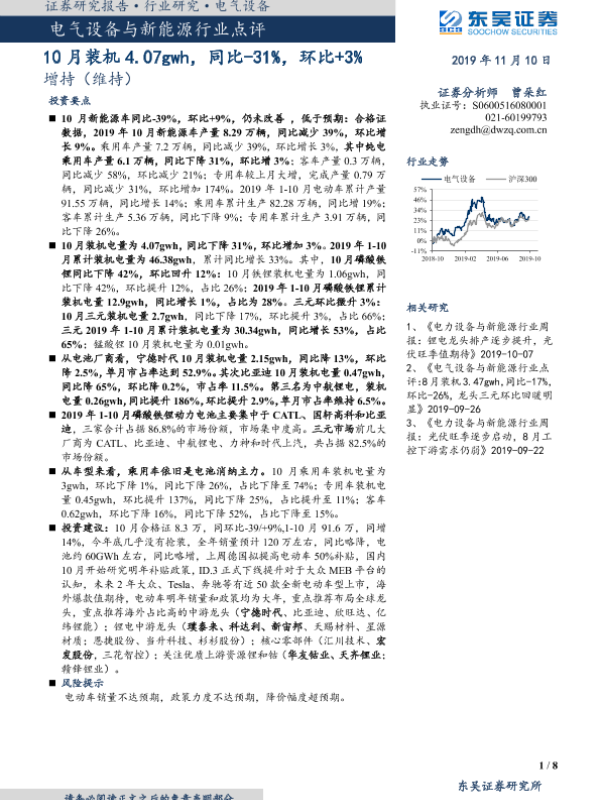【东吴证券】【20191110】电气设备与新能源行业点评:10月装机4.07gwh,同比-31%,环比+3%-8页
