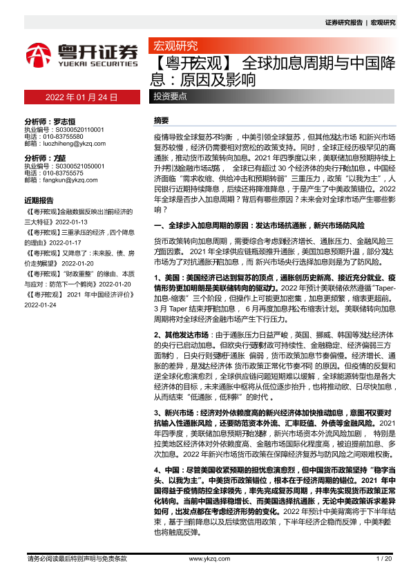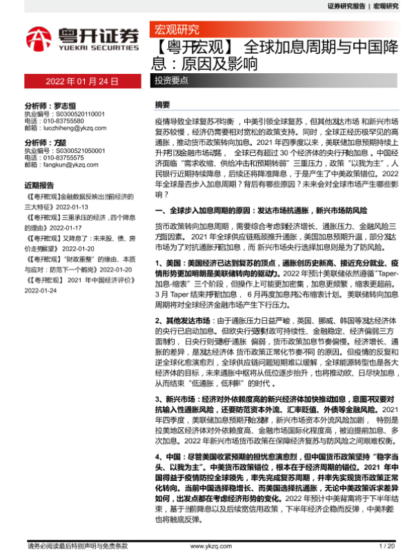 【粤开证券】【20220124】全球加息周期与中国降息:原因及影响-20页