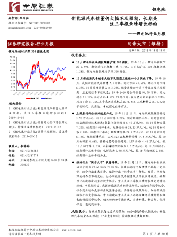 【中原证券】【20191111】锂电池行业月报:新能源汽车销量仍大幅不及预期,长期关注三季报业绩增长标的-20页
