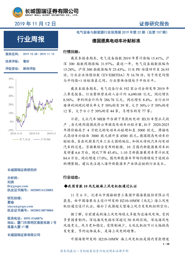 【长城国瑞证券】【20191112】电气设备与新能源行业双周报2019年第22期(总第157期):德国提高电动车补贴标准-28页
