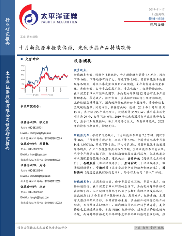 【太平洋证券】【20191117】20191117-太平洋-电气设备行业周报:十月新能源车抢装偏弱,光伏多晶产品持续跌价-18页
