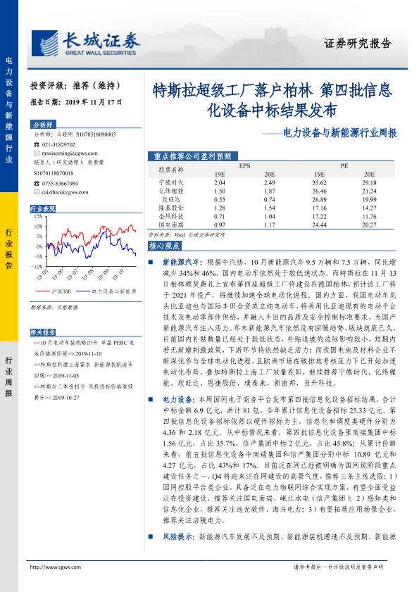 【长城证券】【20191117】20191117-长城证券-电力设备与新能源行业周报:特斯拉超级工厂落户柏林 第四批信息化设备中标结果发布-16页