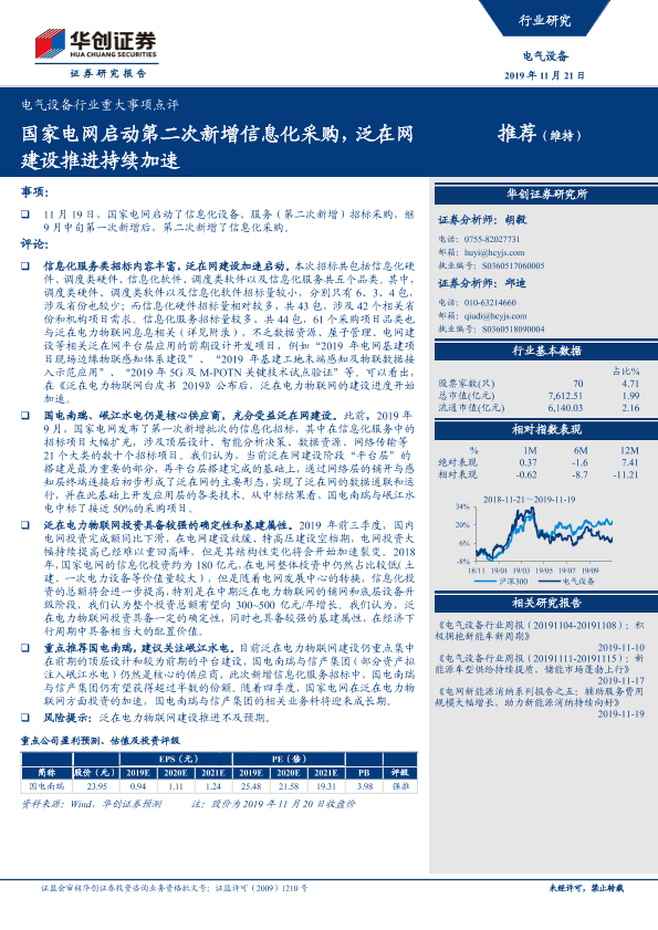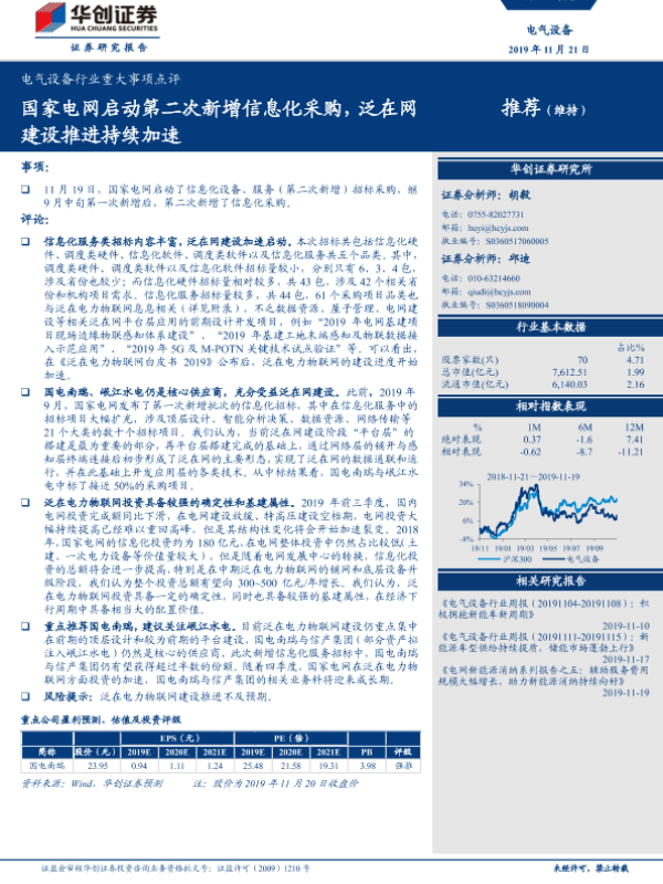 【华创证券】【20191121】电气设备行业重大事项点评:国家电网启动第二次新增信息化采购,泛在网建设推进持续加速-9页
