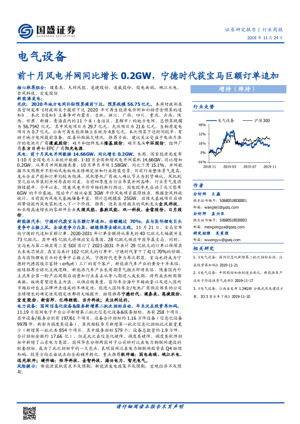 【国盛证券】【20191124】20191124-国盛证券-电气设备行业周报:前十月风电并网同比增长0.2GW,宁德时代获宝马巨额订单追加-19页