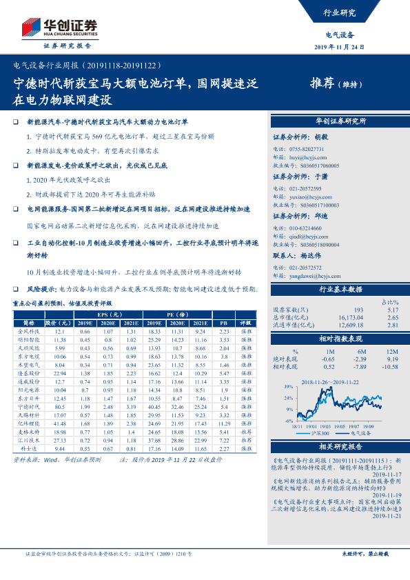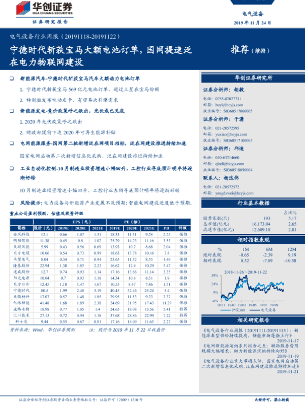【华创证券】【20191124】电气设备行业周报:宁德时代斩获宝马大额电池订单,国网提速泛在电力物联网建设-28页
