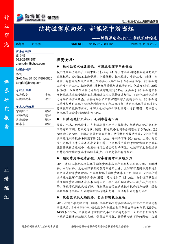 【渤海证券】【20191126】新能源电池行业三季报业绩综述:结构性需求向好,新能源中游崛起-19页