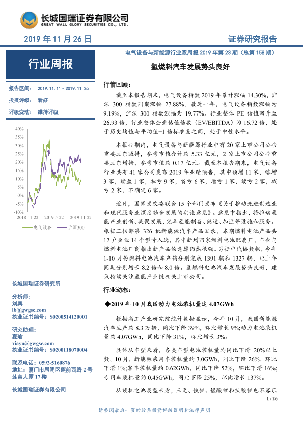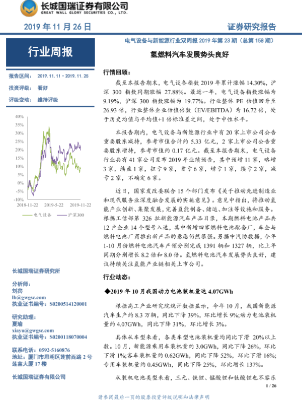 【长城国瑞证券】【20191126】电气设备与新能源行业双周报2019年第23期(总第158期):氢燃料汽车发展势头良好-26页