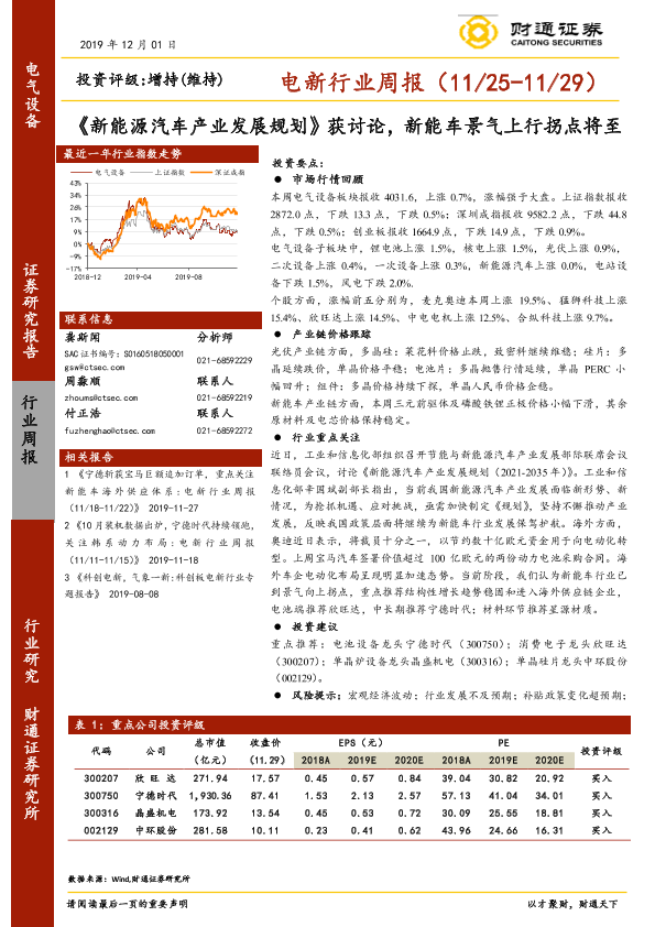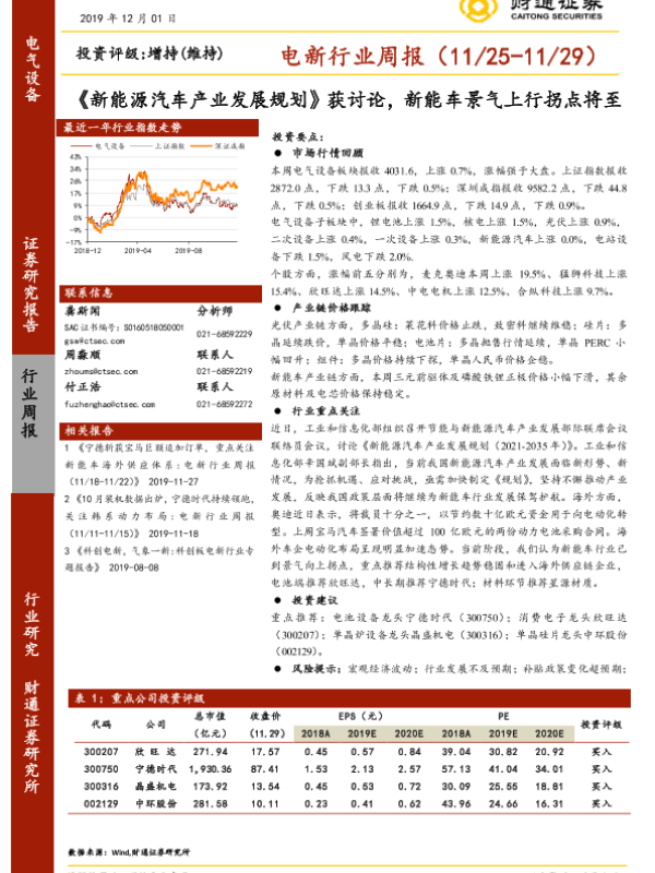 【财通证券】【20191201】20191201-财通证券-电新行业周报:《新能源汽车产业发展规划》获讨论,新能车景气上行拐点将至-14页