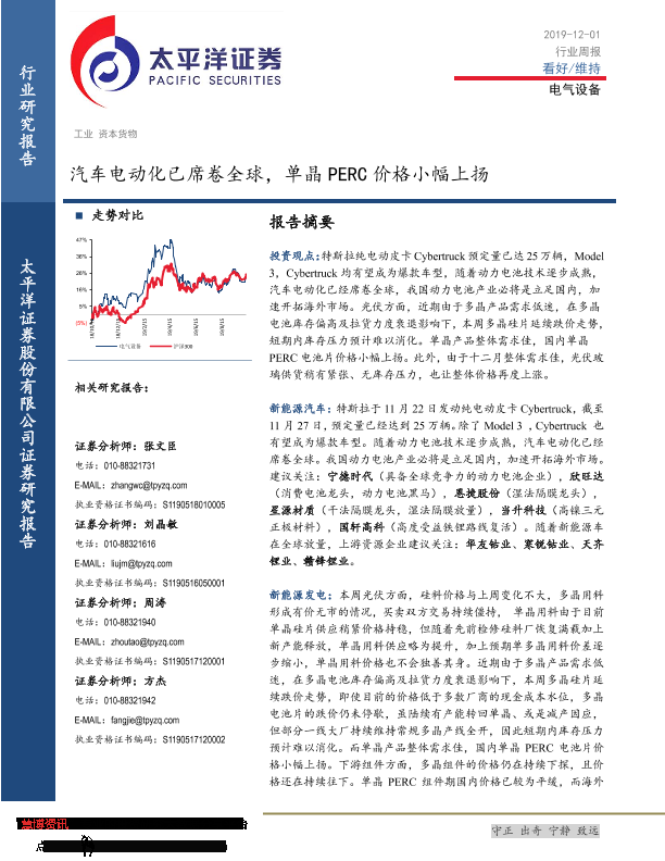 【太平洋证券】【20191201】电气设备行业周报:汽车电动化已席卷全球,单晶PERC价格小幅上扬-18页