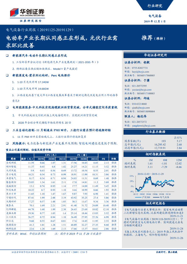 【华创证券】【20191201】电气设备行业周报:电动车产业长期认同感正在形成,光伏行业需求环比改善-26页