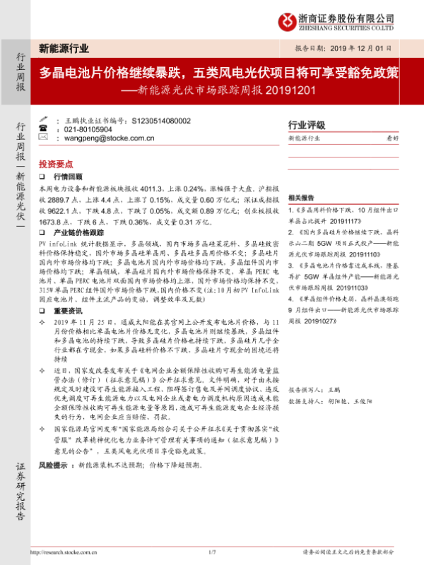 【浙商证券】【20191201】20191201-浙商证券-新能源光伏市场跟踪周报:多晶电池片价格继续暴跌,五类风电光伏项目将可享受豁免政策-7页