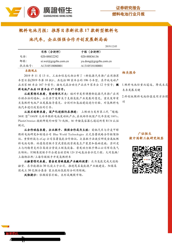 【广证恒生】【20191203】燃料电池月报:推荐目录新收录17款新型燃料电池汽车,企业强强合作开创发展新局面-11页