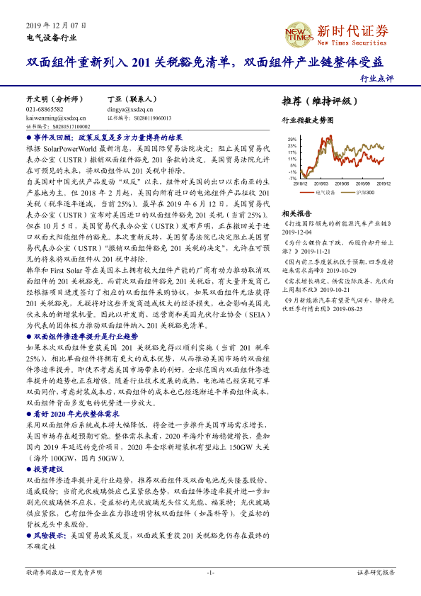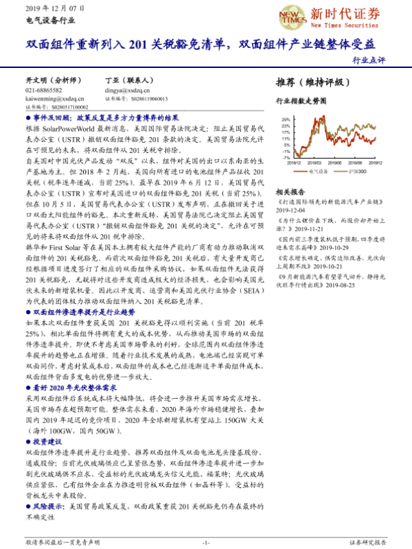 【新时代证券】【20191207】电气设备行业:双面组件重新列入201关税豁免清单,双面组件产业链整体受益-3页