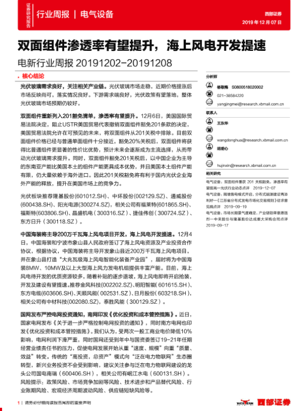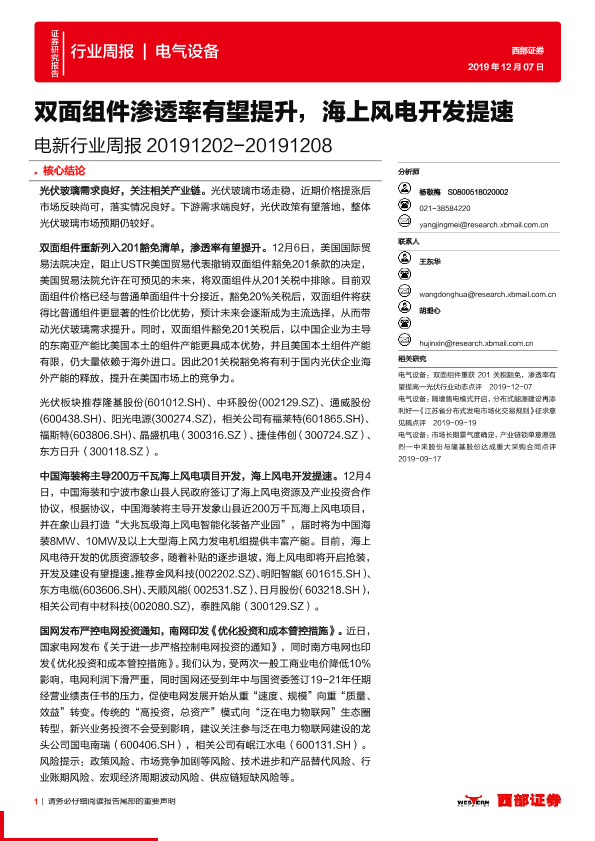 【西部证券】【20191207】电新行业周报:双面组件渗透率有望提升,海上风电开发提速-8页