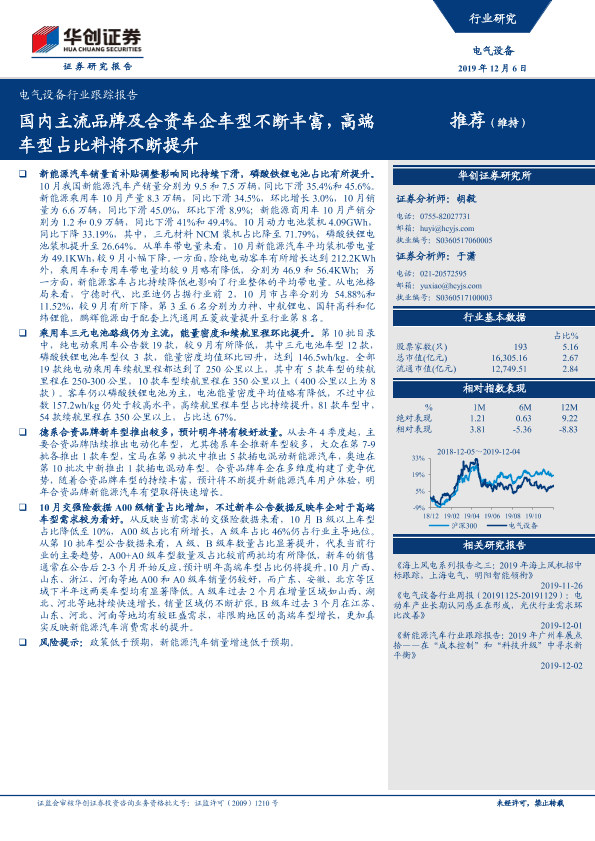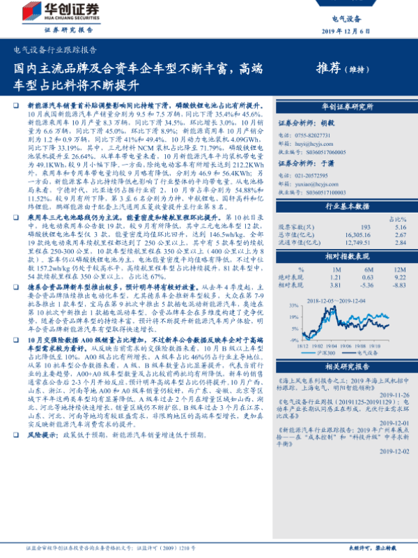 【华创证券】【20191206】电气设备行业跟踪报告:国内主流品牌及合资车企车型不断丰富,高端车型占比料将不断提升-16页