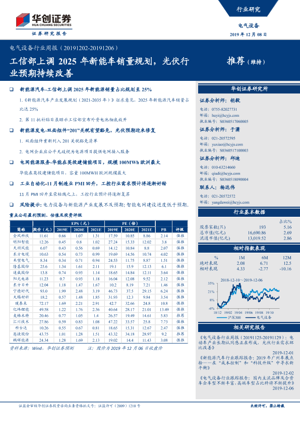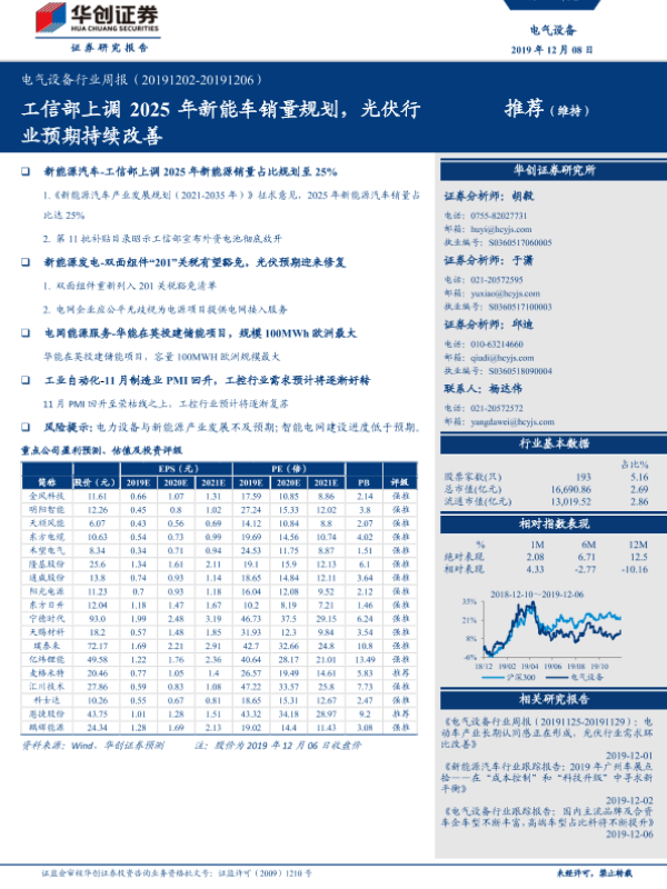 【华创证券】【20191208】电气设备行业周报:工信部上调2025年新能车销量规划,光伏行业预期持续改善-27页