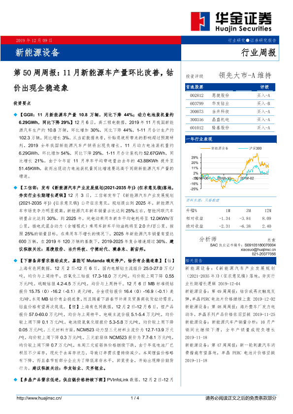 【华金证券】【20191209】新能源设备第50周周报:11月新能源车产量环比改善,钴价出现企稳迹象-4页