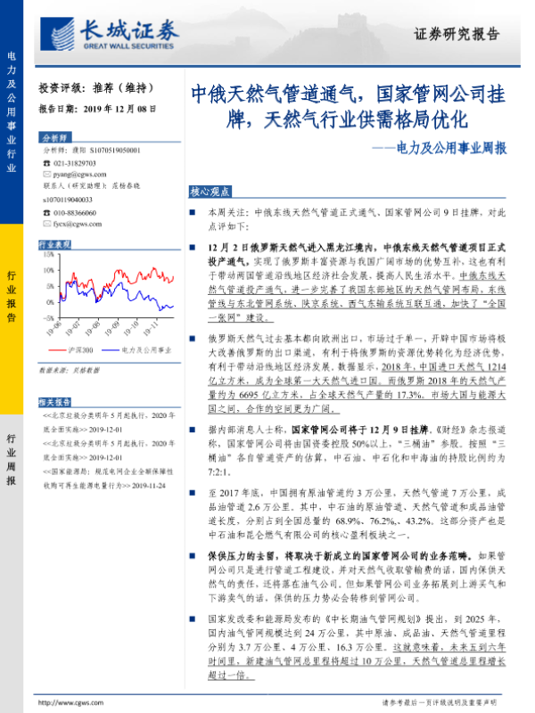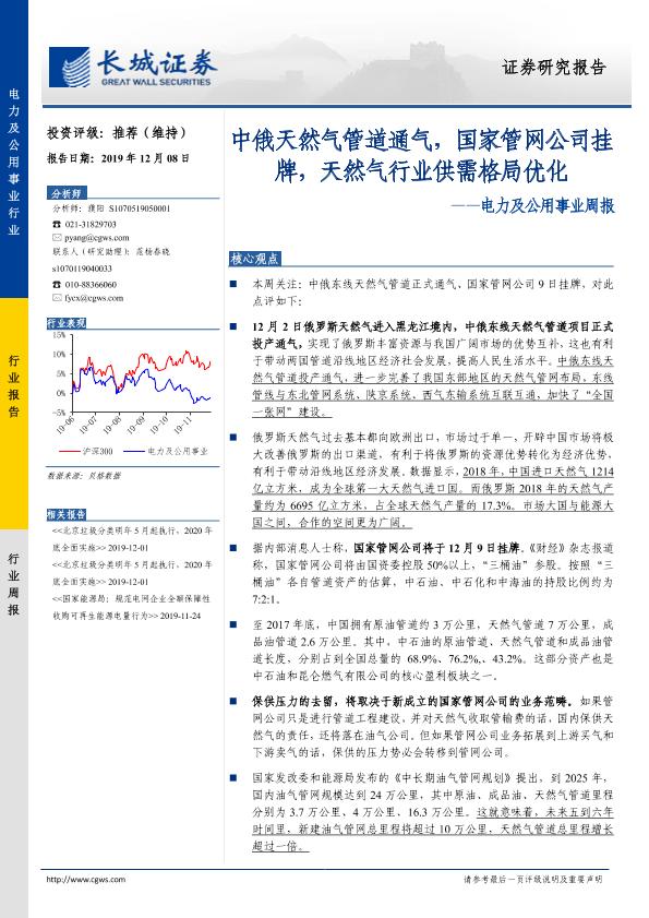 【长城证券】【20191208】20191208-长城证券-电力及公用事业周报:中俄天然气管道通气,国家管网公司挂牌,天然气行业供需格局优化-14页