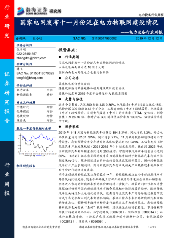 【渤海证券】【20191212】电力设备行业周报:国家电网发布十一月份泛在电力物联网建设情况-13页