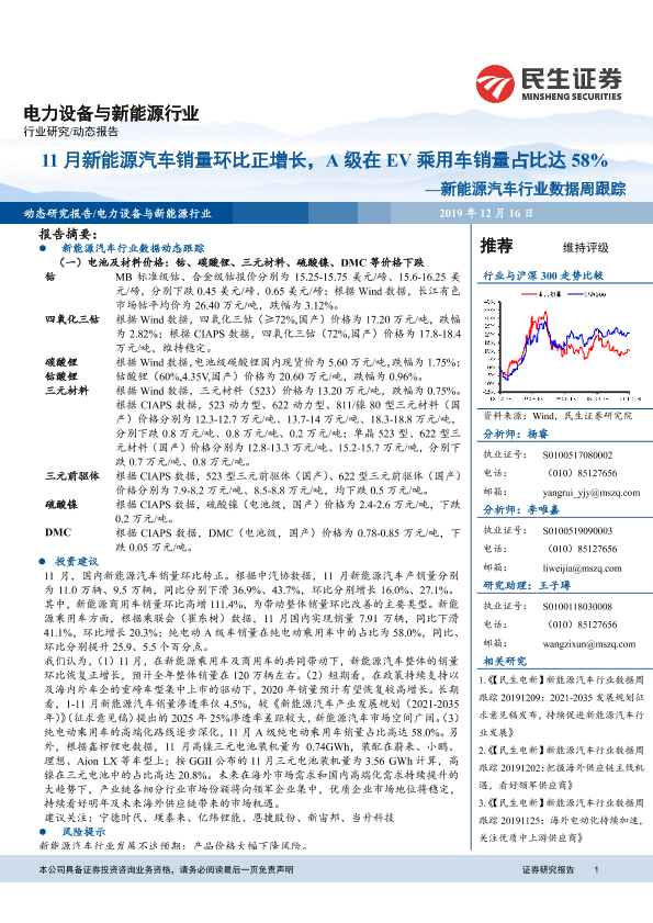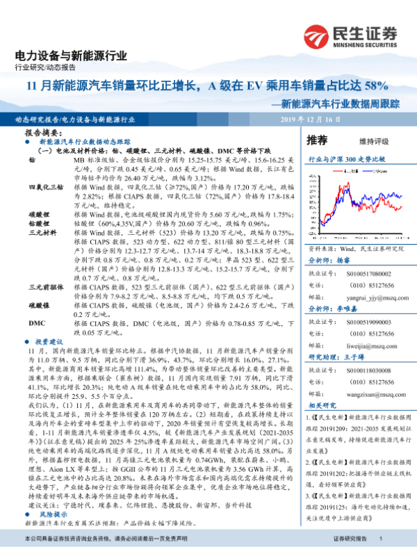 【民生证券】【20191216】20191216-民生证券-新能源汽车行业数据周跟踪:11月新能源汽车销量环比正增长,A级在EV乘用车销量占比达58%-13页