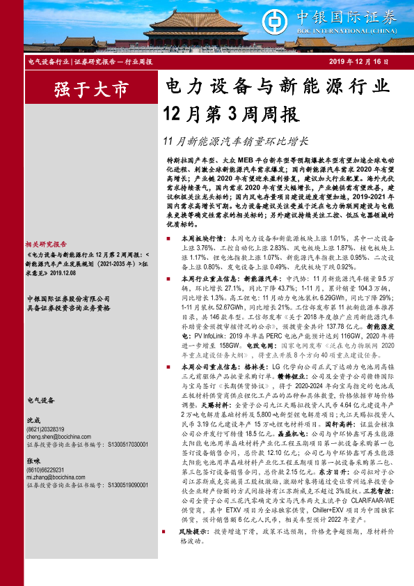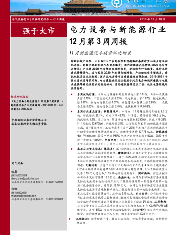 【中银证券】【20191216】电力设备与新能源行业12月第3周周报:11月新能源汽车销量环比增长-18页