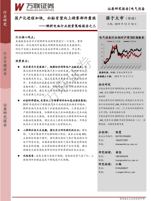 【万联证券】【20191218】20191218-万联证券-燃料电池行业投资策略报告之三:国产化进程加快,补贴有望向上游零部件靠拢-33页