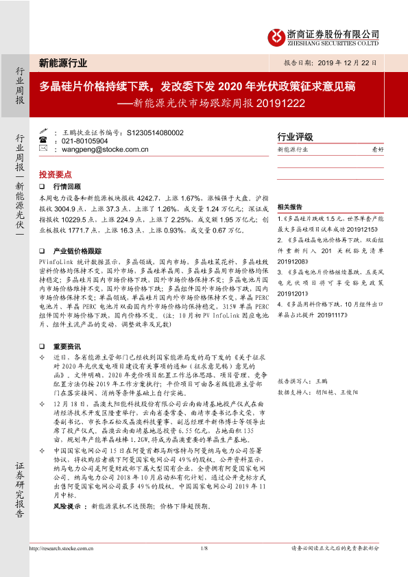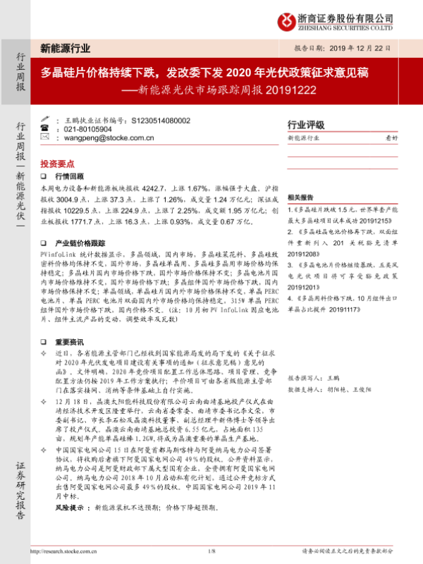 【浙商证券】【20191222】20191222-浙商证券-新能源光伏市场跟踪周报:多晶硅片价格持续下跌,发改委下发2020年光伏政策征求意见稿-8页
