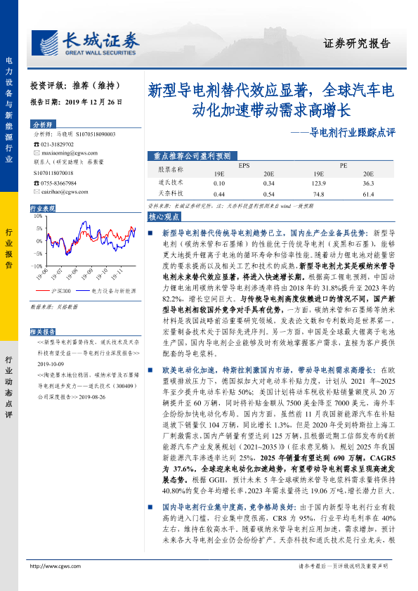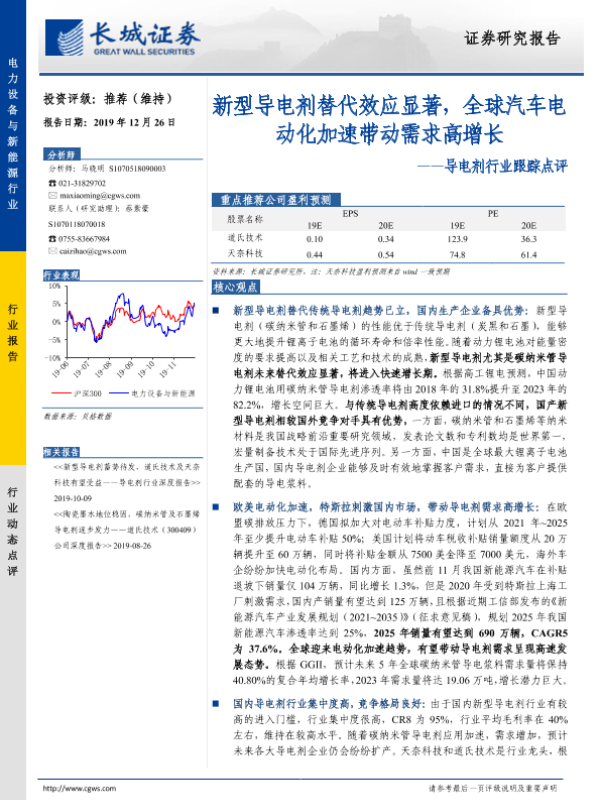 【长城证券】【20191226】导电剂行业跟踪点评:新型导电剂替代效应显著,全球汽车电动化加速带动需求高增长-3页