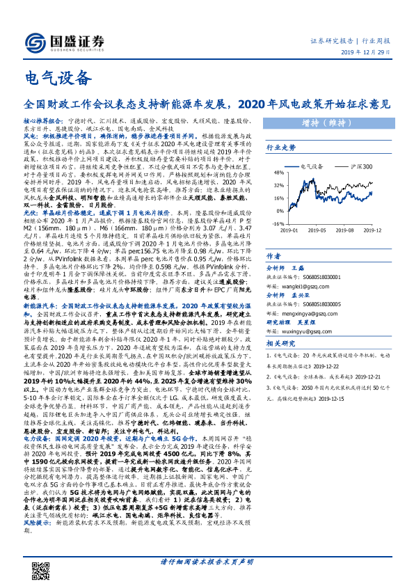 【国盛证券】【20191229】电气设备行业周报:全国财政工作会议表态支持新能源车发展,2020年风电政策开始征求意见-18页