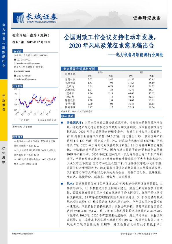 【长城证券】【20191229】电力设备与新能源行业周报:全国财政工作会议支持电动车发展,2020年风电政策征求意见稿出台-16页